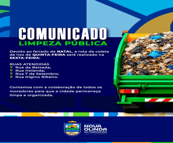 A Prefeitura Municipal de Nova Olinda do Maranhão, por meio da Secretaria responsável pela Limpeza Pública, informa à população que, em virtude do feriado de Natal, a rota de coleta de lixo prevista para a quinta-feira será realizada excepcionalmente na sexta-feira.